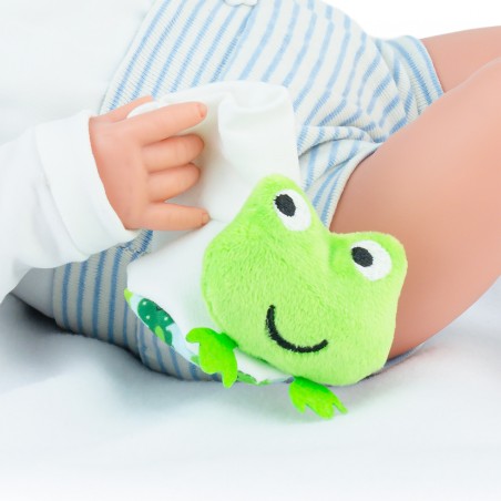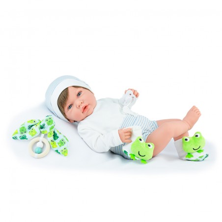 Articulated doll of 45 cm. He wears striped panties with matching T-shirt and hat. He wears funny socks printed with stuffed animals in the shape of a frog and matching pacifier. It has a soft body and head and limbs of soft vinyl plastic. Presented in a box.
