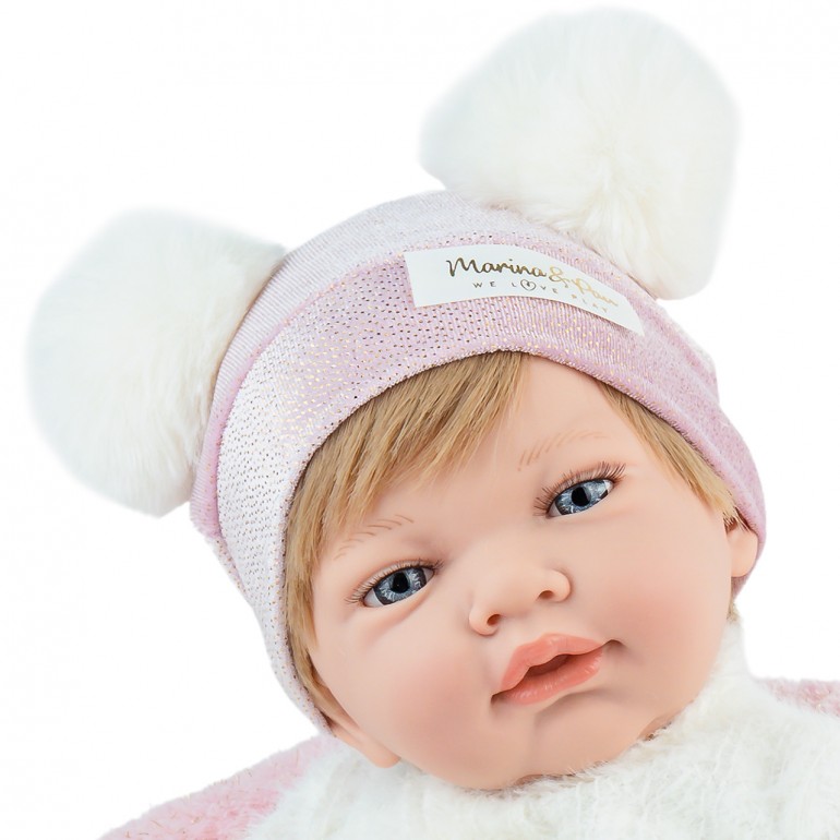Reborn doll 42 cm fully manufactured in Spain with high quality materials. It is articulated, adopts the postures of a baby. She is dressed in a pink panties, hat with matching pompoms and angora sweater and booties. Includes soft cushion and birth certificate. Comes in a beautiful box.