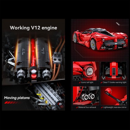Diseñado por el conocido jugador de MOC T-lego, modelo de superdeportivo de colección estática 1: 8, todo el modelo tiene una nariz delantera con elementos F1, rejilla de entrada de aire grande, presa de aire central ancha, luces icónicas, luces de advertencia de freno similares a F1, quad bilateral escape, espejo retrovisor ligero y el interior también es muy emocionante, asientos deportivos, ruedas personalizadas y discos de freno.El exterior tiene una apariencia maravillosa y un fascinante encanto mecánico.1. Palanca de cambios, cambio de cuatro marchas;2. Caja de cambios secuencial de 4 velocidades, siente el encanto de la transmisión mecánica;3.Suspensión variable, la altura se puede ajustar, gire el engranaje para ajustar la altura de la suspensión delantera, para garantizar la forma estable del automóvil deportivo;4. El volante gira hacia la rueda de conexión y la suspensión se inclina al mismo tiempo.5. Las puertas de mariposa de doble cara se pueden abrir, la cubierta delantera se puede abrir y el capó trasero se puede abrir, por lo que es conveniente apreciar el icónico motor V12; el motor va unido a las ruedas6. El alerón trasero se levanta y se une al difusor, y la palanca se ajusta para ajustar el ángulo del alerón trasero y el difusor.