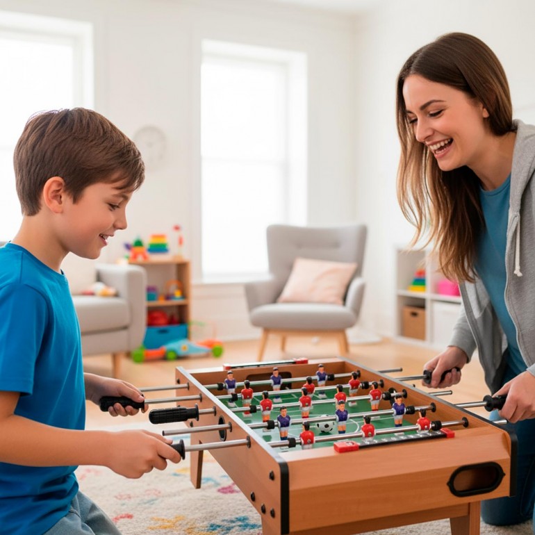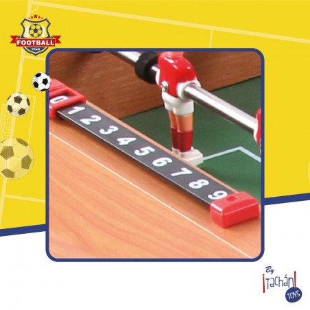 Futbolín de madera de sobremesa con patas cortas de 70 cm de alto. Incluye 2 marcadores ma...