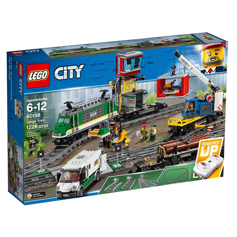 Prepara el Tren de Mercancías LEGO City (60198) para el trayecto de hoy. Usa la carretilla elevadora para cargar las cajas en los contenedores y colócalos después en el vagón con la grúa. Engancha todos los vagones a la locomotora, súbete a la cabina, haz sonar el silbato y ponte en marcha. Entrega la mercancía a tiempo y asegúrate de que todo llegue a su destino en LEGO City. Accesorios incluidos: una llave inglesa, 12 lingotes de oro y 4 billetes, además de 2 palés, 3 troncos y una motonieve para construir.