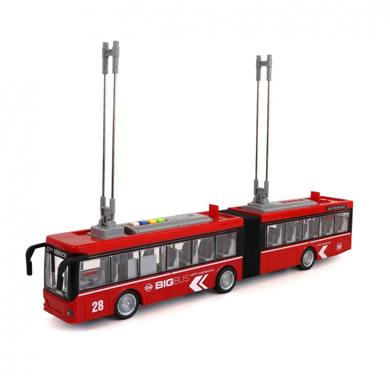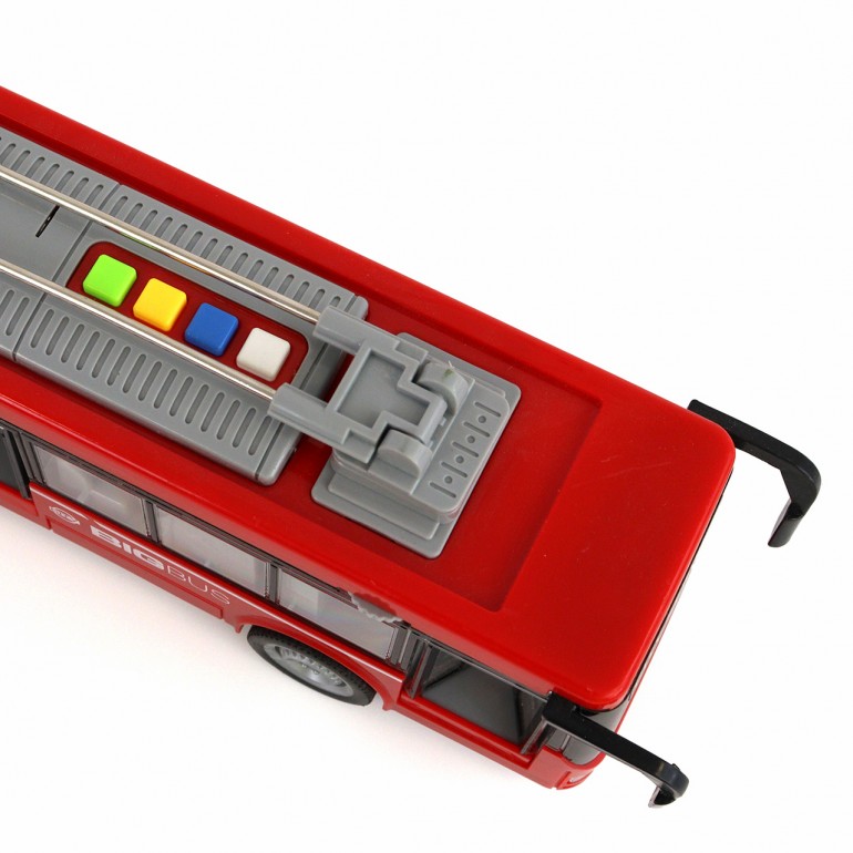 Autobús doble de ciudad 1:16, se impulsa con fricción, pulsa para que emita sonidos y encienda luces. Funciona con 3 pilas AG13 incluidas.