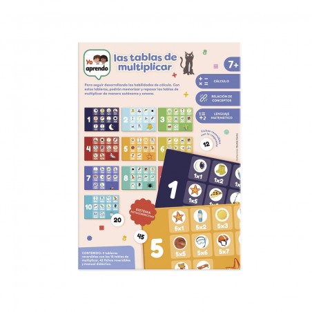 Contenido: 6 láminas a doble cara con las 12 tablas de multiplicar y 59 fichas reversibles