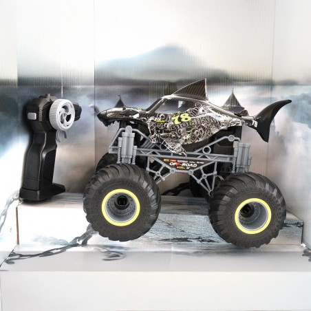 Monster car radio control con forma de tiburón. Se trata de un vehículo escala 1:16. Con un diseño muy agresivo y deportivo.funciona con bateria ya incluida. Gran potencia y velocidad para hacer de cada carrera un momento trepidante. Tiempo de juego: 25 minDistancia de control: hasta 30 metros Recomendado para niños mayores de 3 años.
