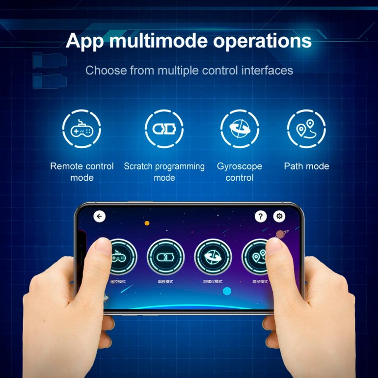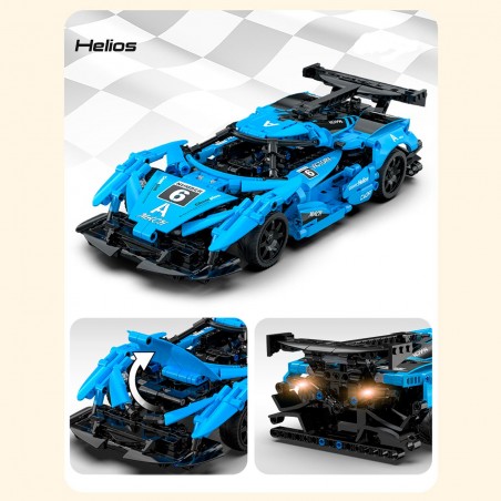 Coche de carreras Helios. El vehículo puede ser controlado por el control remoto de 2.4GHZ y la aplicación Bluetooth. Disfruta de tus turnos con los 4 modos de la App (giroscopio, programación, control desde tu móvil o editar tu propia ruta. Disponible en IOS y Android.La iluminación en la parte delantera y trasera del automóvil se puede controlar de forma remota a través de la aplicación. El volante, el asiento, el alerón trasero y otras partes del vehículo son móviles. Bateria recargable incluída.