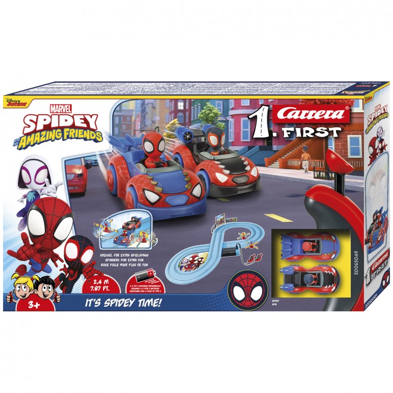Spiderman entra en acción en este circuito Carrera First de temática Spiderman de nada menos que 2,4 metros de largo. En una pista vemos a Spidey, el auto rojo y azul, compitiendo contra Spin, el auto negro y rojo. Deja que tus superhéroes Spiderman compitan y que gane el más rápido.