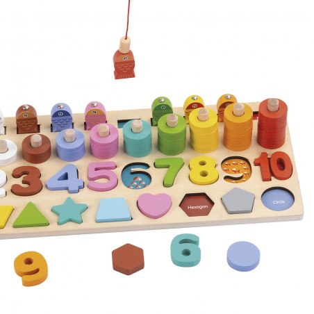 Puzzle de madera encajable con diferentes piezas de numeros, formas, aros, etc