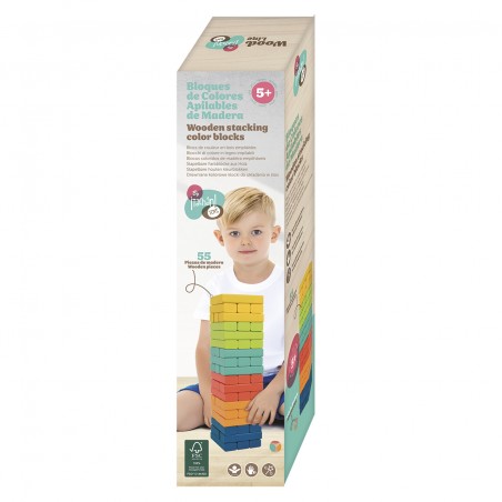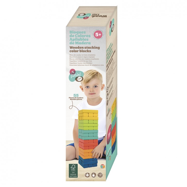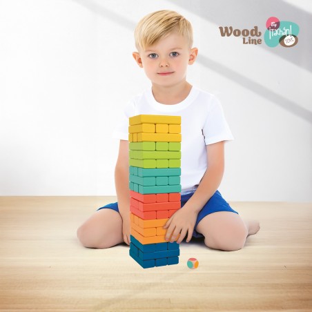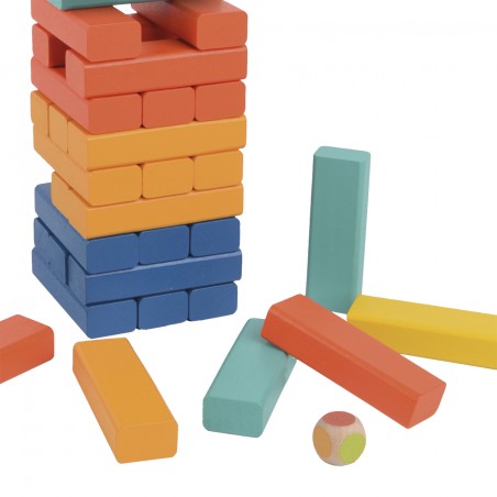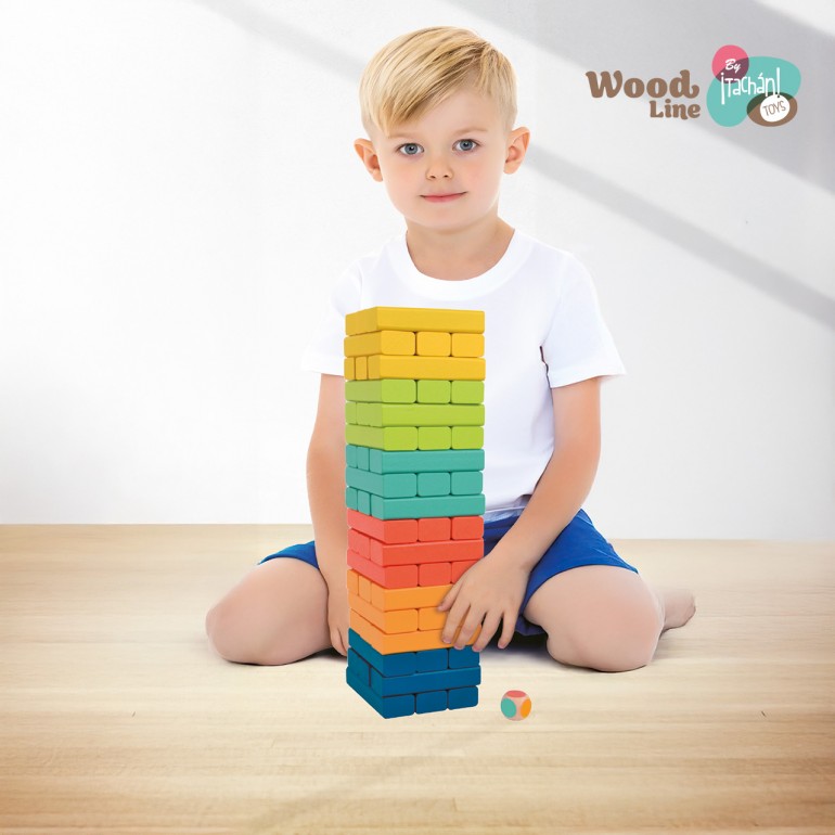 Torre apilable de madera con diferentes colores. Incluye un dado para poder jugar. Los productos tienen la certificación FSC, lo que garantiza que la madera con la que estan fabricados proviene de bosques que preservan la biodiversidad y estan gestionados de forma beneficiosa y ambientalmente responsable.