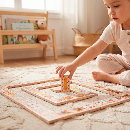 Dominó en caja de madera con ilustraciones divertidas de animales. Los productos tienen la certificación FSC, lo que garantiza que la madera con la que estan fabricados proviene de bosques que preservan la biodiversidad y estan gestionados de forma beneficiosa y ambientalmente responsable.