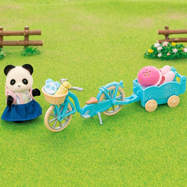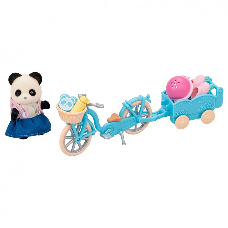 El Set de bicicleta y patines Rosalina Panda Pookie de Sylvanian Families incluye a la Chica Panda Rosalina en un atuendo exclusivo y con complementos, una bicicleta, remolque y patines de ruedas. Conecta la bicicleta al carrito para llevar a un bebé a un paseo o llevar equipaje.