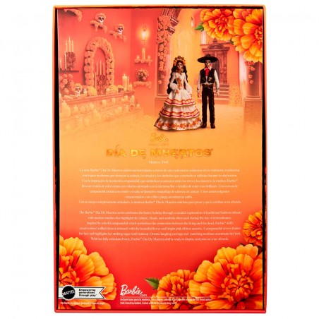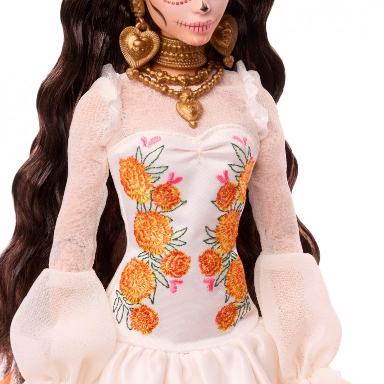 La colección Día de Muertos de Barbie rinde homenaje a esta festividad. El vestido de la muñeca Barbie esta inspirado en la caléndula, que se utiliza tradicionalmente en la cultura mexicana para adornar los altares y las tumbas de los seres queridos. La corona enmarca el llamativo maquillaje de calavera de la muñeca.