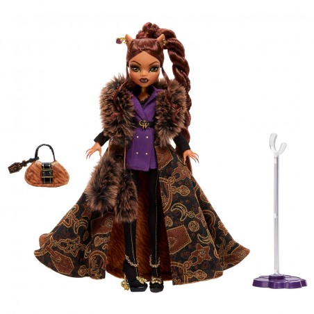 ¡Esta muñeca de Clawdeen Wolf de Monster High presenta a la chica lobo más querida! Su abrigo de jacquard con monograma cuenta con llamativos detalles de piel sintética. La gabardina cae con estilo sobre un vestido chaqueta morado de sarga con botones dorados de tachuela. ¡Clawdeen Wolf está más que preparada para arrasar en la pasarela con sus pantabotas negras! Sus garras engalanadas sujetan el bolso característico de su línea: ¡un bolso de piel sintética con una hebilla con detalles increíbles! Unos pendientes dorados, una gargantilla de cinta y una elegante coleta retorcida completan su feroz conjunto.