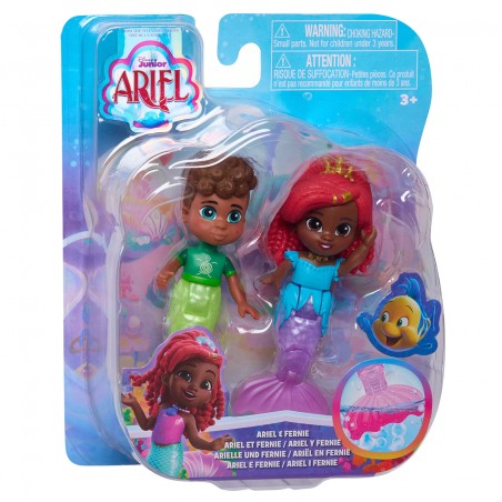 Pack de 2 figuras surtidas de 10 cm inspiradas en la serie de Arial de Disney Junior. Estos juguetes de sirena están diseñados con acabados iridiscentes y sorpresas coloridas.