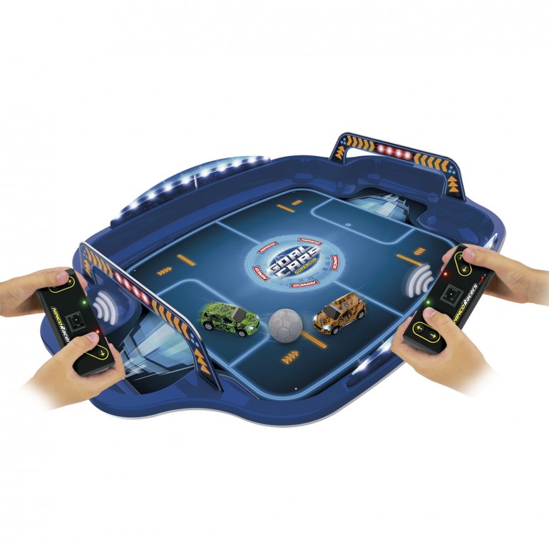 Goalcars Supercup combina la conducción de vehículos de radio control con técnicas de fútbol. Contiene dos vehículos a escala 1:64 equipados con luces, batería y emisora 2.4Ghz. Un estadio de juego montable-desmontable con unas medidas 70x50 cm y un diseño totalmente futurista.
