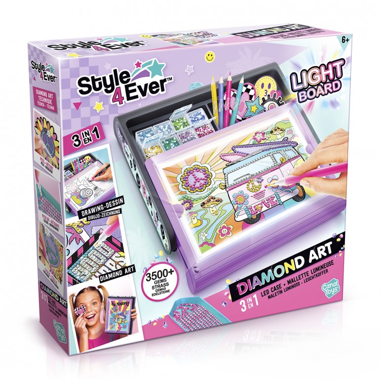 Este maletín luminoso 3 en 1 es ideal para creaciones con diamantes. Con la pizarra luminosa, reproduce y dibuja, crea tus pegatinas con diamantes o crea posters con las dos técnicas. Fácil de transportar, ¡guarda todos tus accesorios dentro!