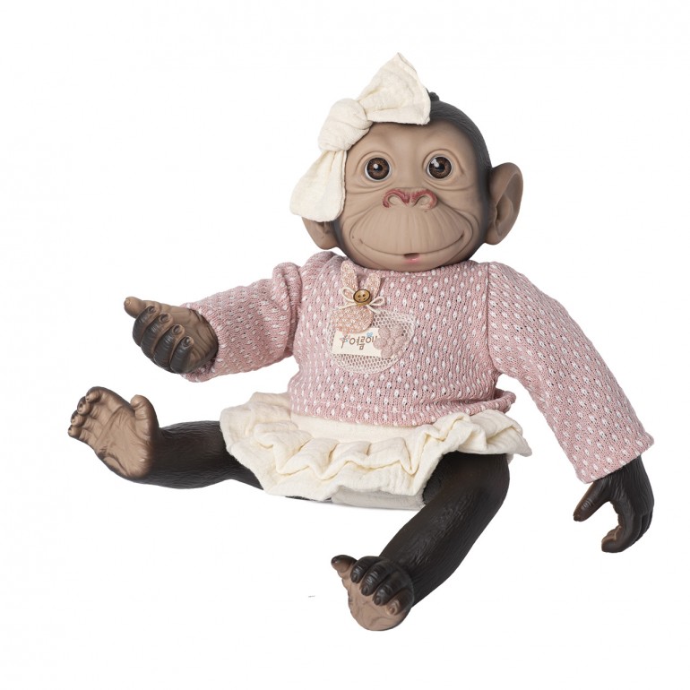Bené mono reborn de vinilo de 35 cm. Vestido con un jersey rosa, falda de tul y un lazo de accesorio.