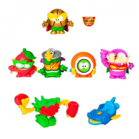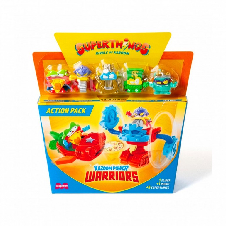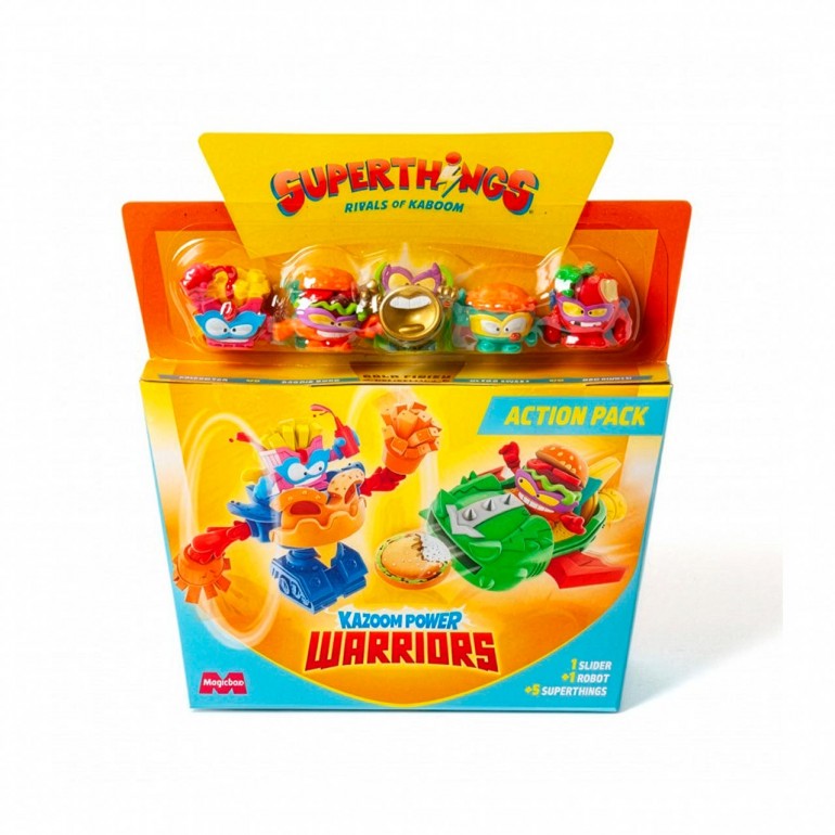 Contiene 5 Superthings (incluye 1 capitán dorado) además de un smsher y 1 slider. Surtido de 4 packs distintos, en doble color.
