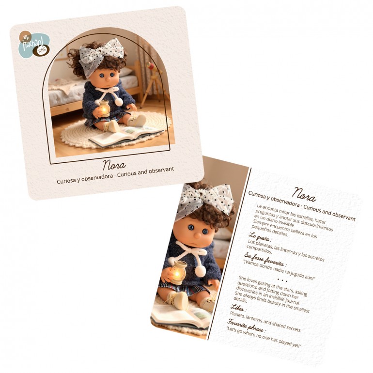NORA es curiosa y observadora. Le encanta mirar las estrellas, hacer preguntas y anotar sus descubrimientos en un diario invisible. Siempre encuentra belleza en los pequeños detalles.