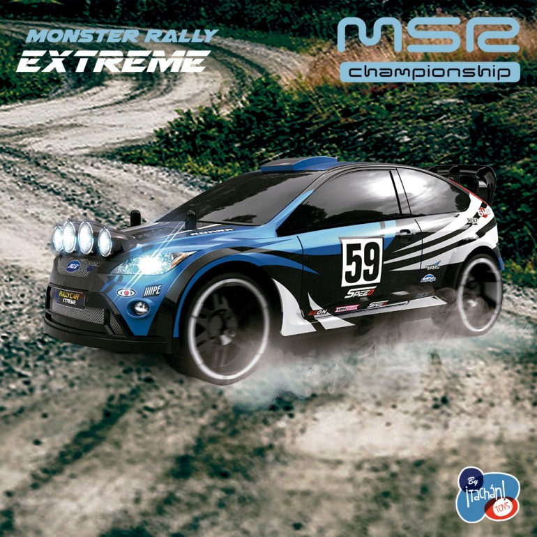 Coche radiocontrol rally estreme, escala 1:16, frecuencia 2,4 GHz, funciona con 3 pilas AA en el coche y 2 pilas AA en el mando, no incluidas. Velocidad 12 km/h.