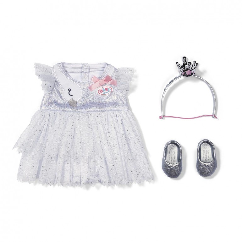 ¡Abre el telón para BABY born con su traje de bailarina! Un elegante y reluciente vestido en blanco liso, con bordados de cisnes, lazo y falda tutú oscilante es un atuendo escénico más que apropiado - con zapatillas de ballet plateadas y una diadema, el conjunto queda literalmente coronado. ¡Toi, toi, toi!