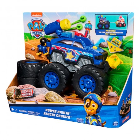 ¡Recrea las emocionantes misiones de rescate con tus personajes favoritos de la serie y los coches Patrulla Canina y vive la diversión en cualquier lugar! Con sus ruedas de gran tamaño, el gancho motorizado, las luces intermitentes y los sonidos, lánzate a la aventura con tu camión lanza proyectiles y pulsa el botón para retraer el gancho y activar las luces y los sonidos. El Power Haulin Rescue Cruiser de Chase incluye dos proyectiles con sus propios compartimentos de almacenamiento. ¡Carga los proyectiles en el lanzador y pulsa el botón para dispararlos y salvar la ciudad!