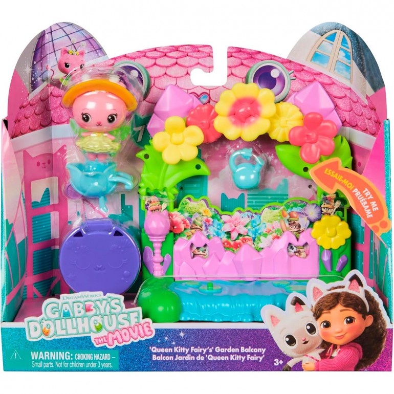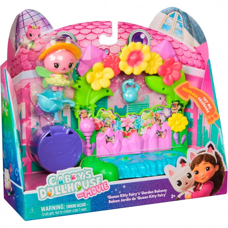 Set de 7 piezas con figura de Kitty Fairy, muebles para la casa y decoración de flores giratorias para un juego táctil satisfactorio. El balcón se engancha a cualquier casita de Gabby y permite a los niños decorar con piezas encajables, descubrir funciones ocultas y jugar con Kitty Fairy y accesorios.