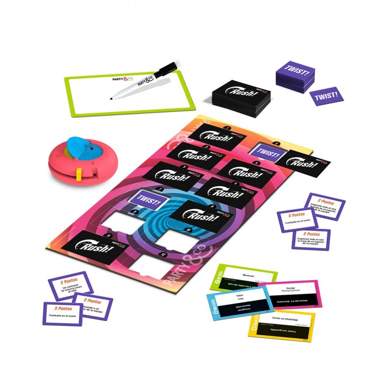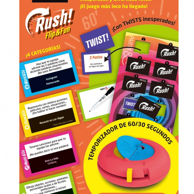 Nuevo Party & Co. Rush, ¡donde el tiempo es tu mayor desafío! Esta edición más rápida y ágil transforma cada partida en una emocionante carrera contrarreloj. Con 4 categorías únicas: Word & Co., Show & Co., Art & Co., Music & Co.. Con twists inesperados que crean momentos inolvidables y risas interminables. ¡El juego más loco ha llegado!