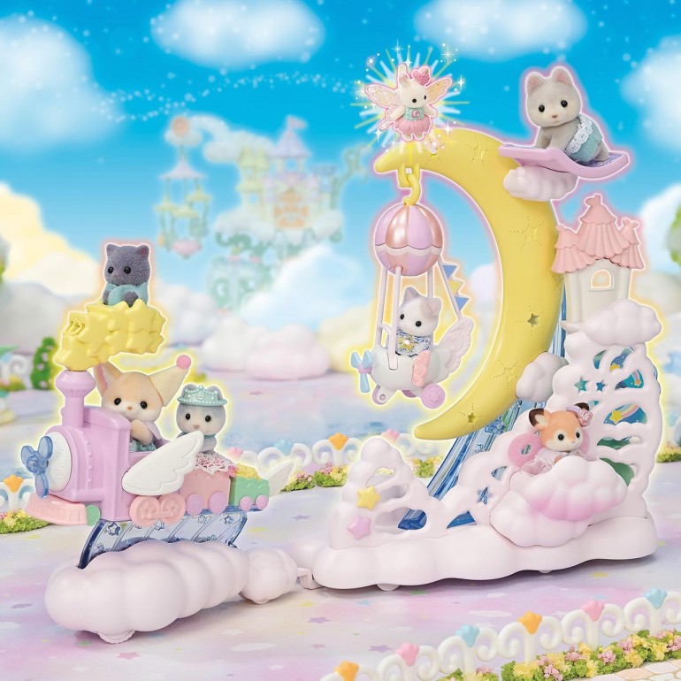 Un set que incluye una carroza lunar, un tren de vapor, una nave espacial y el bebé acunado de Latte Cat. ¡Conecta el tren de vapor y la carroza lunar y disfruta de un desfile! El tren de vapor se balancea al moverse. La luna se balancea, ¡y la nave espacial donde se sientan las figuras del bebé acunado también!