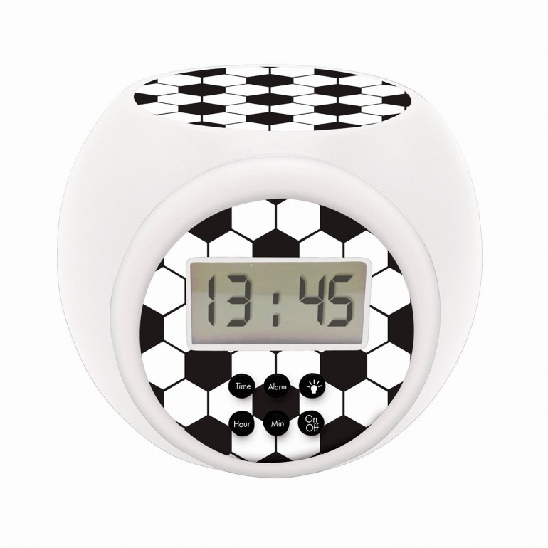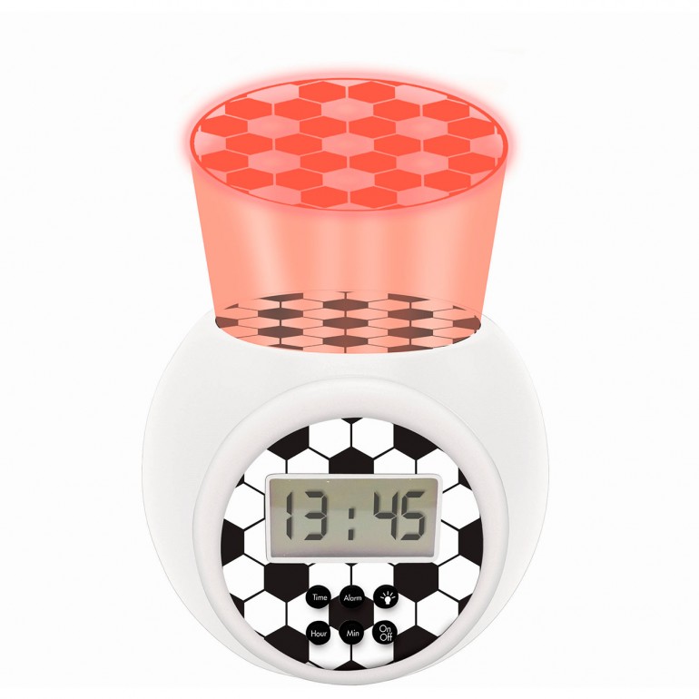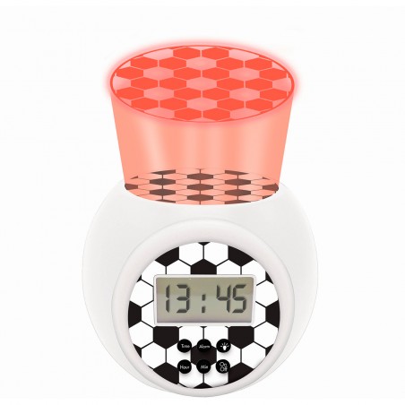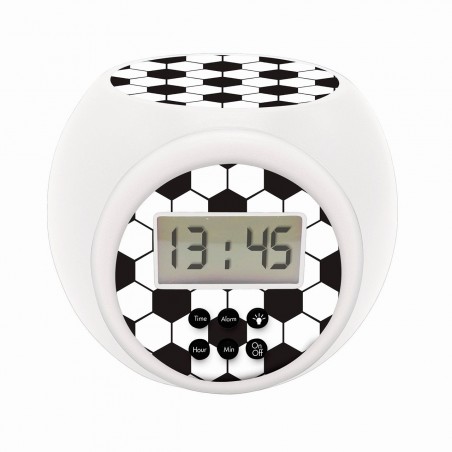 Reloj despertador fútbol con proyección para los niños con pantalla LCD retroiluminada en azul. Proyección de un balón de fútbol en tu techo en 3 colores diferentes para crear un ambiente increíble por la noche. Con temporizador automático integrado de 5, 15, 30 minutos.