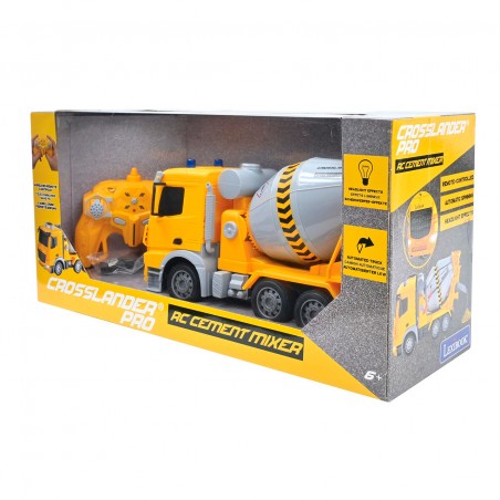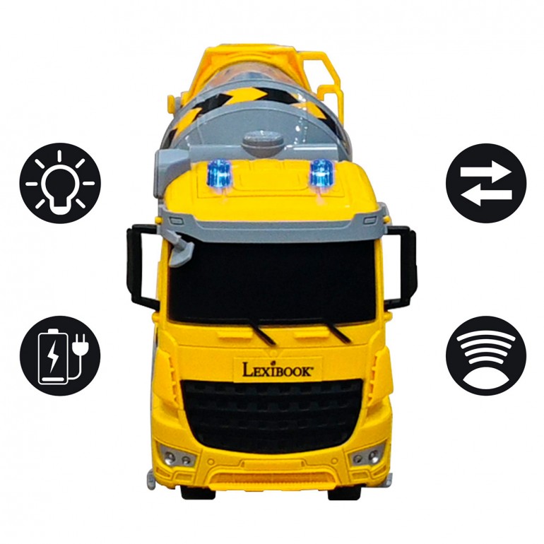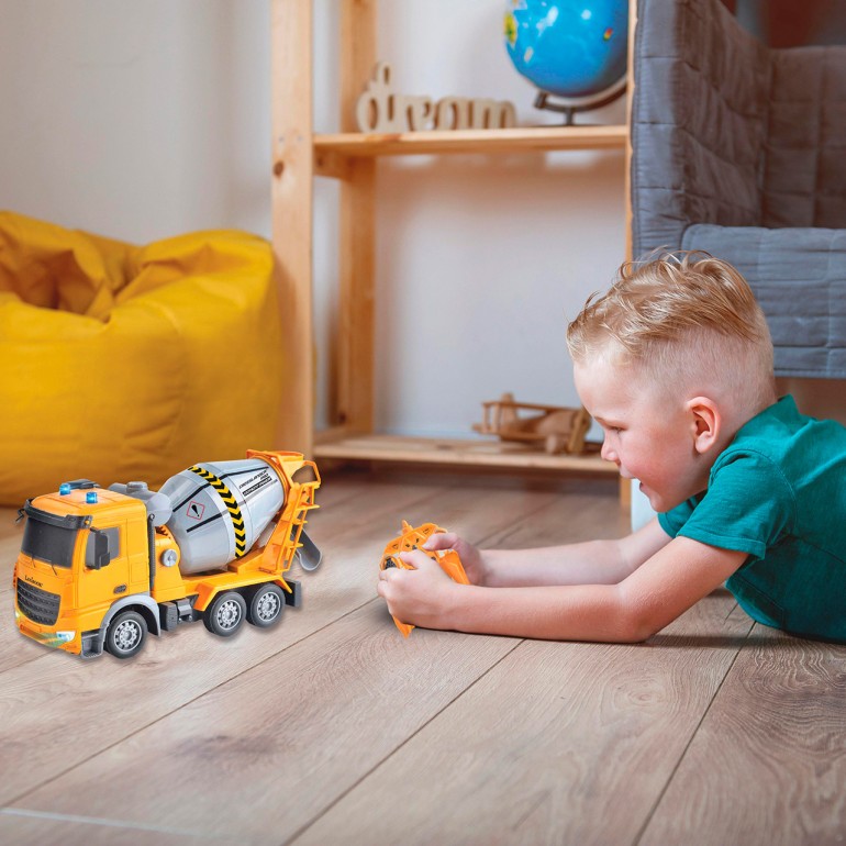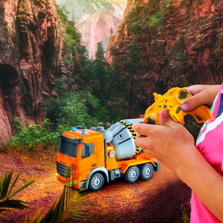 Camión volquete multifuncional con control remoto. Tanque mezclador de cemento con giro de 360 grados. ¡Llena el volquete y vacía la grava! Efectos de luz giratoria y luces delanteras.