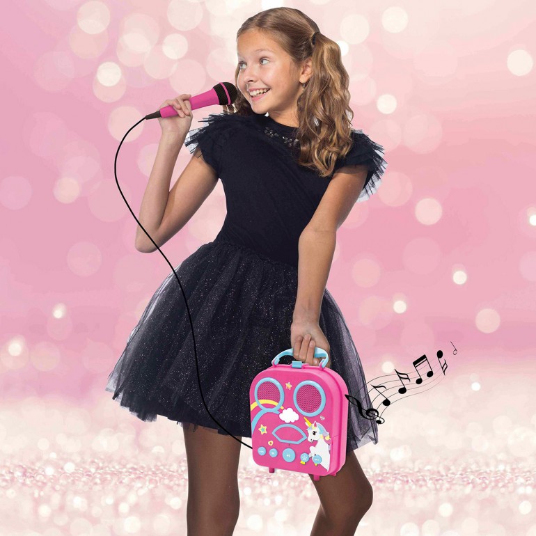 El karaoke del unicornio lleva un altavoz integrado en un precioso maletín. Super práctico para escuchar tus canciones favoritas en cualquier sitio y desde cualquier dispositivo.