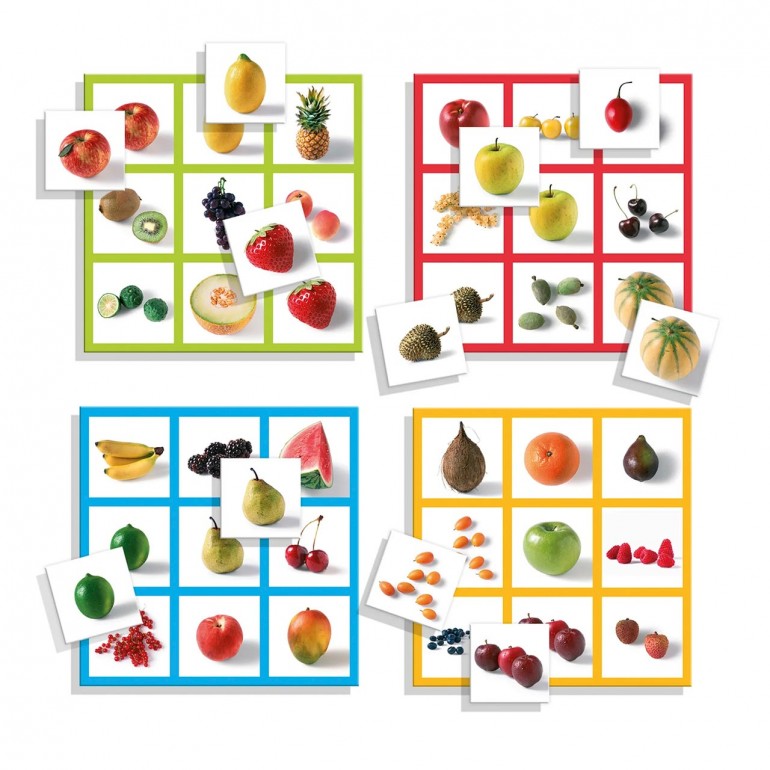 Juego educativo Loto de las frutas. Son 3 juegos en 1 que te permiten jugar de tres maneras distintas. Con 4 tableros reversibles, 36 fichas con imágenes de frutas y una dicha didáctica de frutas.