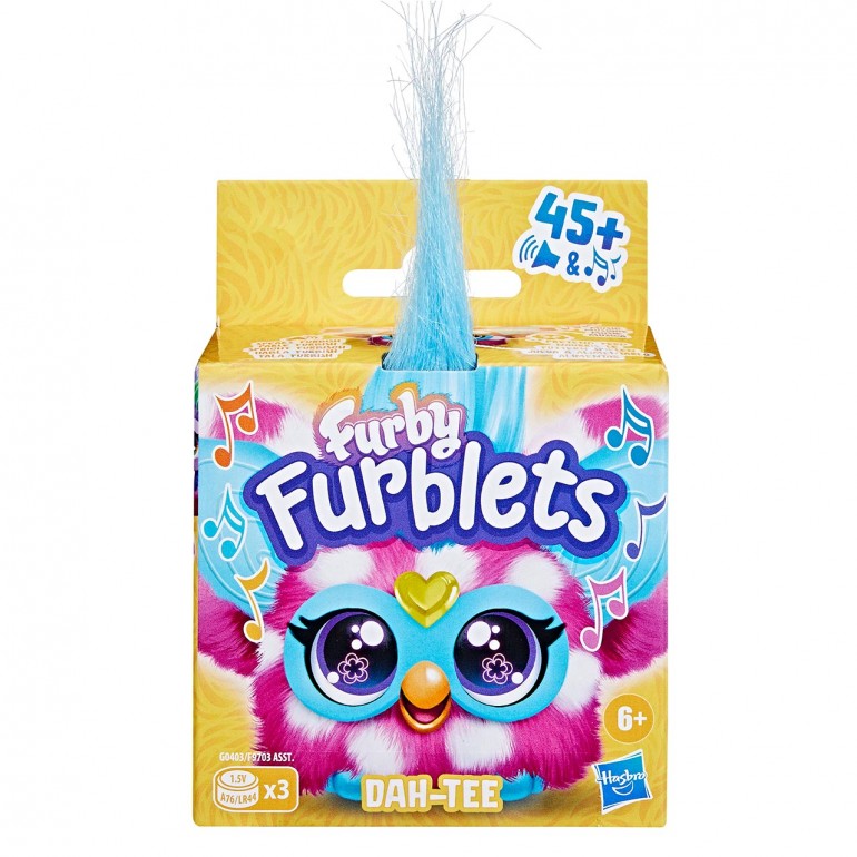 ¡Los Furblets son miniFurbys con sus propias y únicas personalidades musicales y diseños peludos! Dah-Tee es un juguete musical que toca melodías country y dice cómicas frases en el idioma Furbish (no habla ningún idioma humano). Presiona el pico para escuchar los divertidos sonidos que hace ""al comer"" y toca la gema en forma de corazón para escuchar música. La parte superior de la cabeza enciende y apaga el juguete y activa divertidas frases en Furbish.