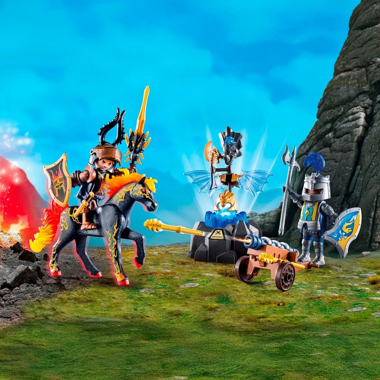Los caballeros de Novelmore luchan contra los bandidos de Burnham por la poderosa Armadura Dragón. ¡Esta armadura permite a su portador volar como un dragón y le otorga ventajas especiales en combate! ¿Quién saldrá victorioso? El set incluye todo lo necesario para emocionantes batallas: dos caballeros, un caballo flameante, un cañón con proyectiles, así como varias armas y piezas de armadura. Ideal para juegos de rol y combates llenos de acción.