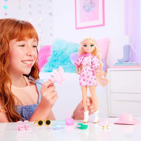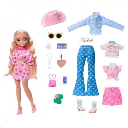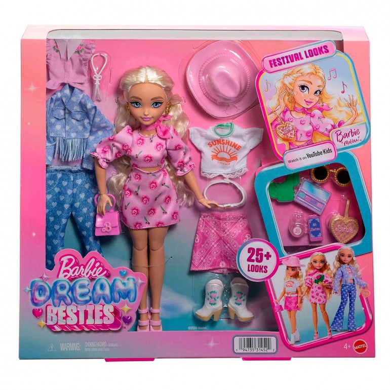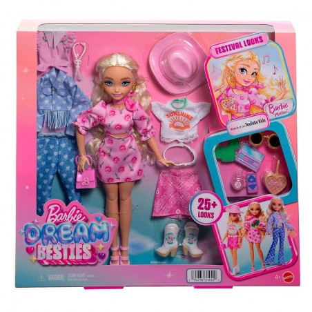 Barbie 'Malibu' está planeando sus trajes para su festival de música favorito. El conjunto de Festival Looks Dream Besties anima a los niños a expresar cómo se sienten a través de la diversión de la moda. Ayuda a Barbie a elegir un atuendo para un festival vibrante y único. Puede mezclar y combinar con dos blusas, una falda rosa cachemira, una chaqueta de flecos de mezclilla con un par de jeans estampados con corazón a juego y un vestido estampado de rosa con diferentes tipos de accesorios elegantes como sombrero de vaquero, paleta de maquillaje y bolsos, Barbie puede hacer que su atuendo destaque Barbie también tiene cabello largo y rubio para divertirse con estilo.