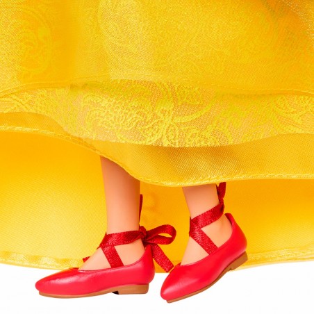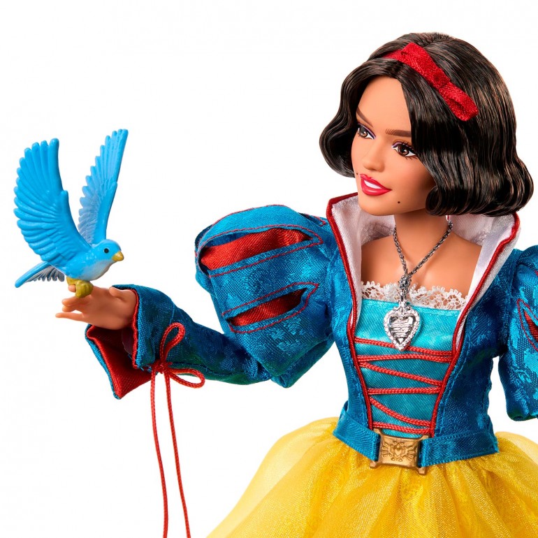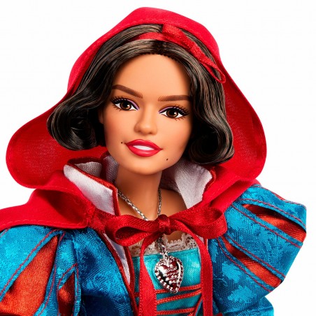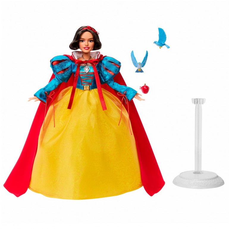 Con motivo del estreno de la película de acción real Blancanieves, de Disney, esta muñeca de Blancanieves especial para coleccionistas representa a esta heroína, valiente a la par que bondadosa, con detalles inolvidables. Blancanieves lleva un vestido espectacular con mangas abombadas rojas y azules, un cuello blanco portentoso, y una gran falda de tres capas de tejido satinado y transparente. Completa su look de princesa con una capa abullonada roja con capucha. Los accesorios son exquisitos, e incluyen dos pajaritos azules que pueden posarse en las manos de Blancanieves, una manzana roja y brillante, un colgante de corazón y una diadema y unos zapatos con cintas del color rojo característico de este personaje.