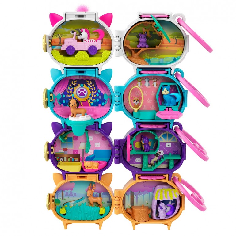 ¡Los estuches de Pet Connects de Polly Pocket acumulan diversión en el tiempo de juego! Cada juguete portátil presenta una forma de animal adorable por fuera y se abre para descubrir una aventura de temática animal en el interior. Una micromuñeca, una figura de animal, un accesorio para imaginar historias y acciones activadas por los niños y niñas llenan el conjunto de juego y estimulan la imaginación. Los niños y las niñas pueden coleccionarlos todos y apilar los estuches uno encima del otro para construir un mundo más grande. Los clips en forma de corazón se enganchan a las mochilas y muchas más cosas para llevar los estuches a cualquier parte.