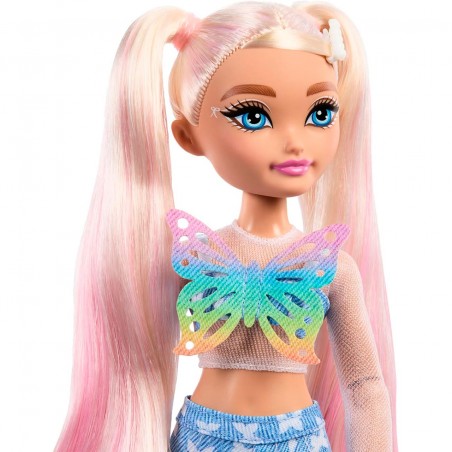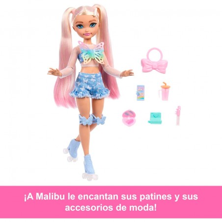 A la muñeca Barbie 'Malibu' de Barbie Dream Besties le encanta patinar sobre ruedas. ¡Mira cómo patina con su conjunto lleno de detalles con accesorios de divertidas temáticas! Viene con accesorios temáticos, como su brillo de labios, espejo de bolsillo en forma de corazón, bolso de lazo, rodilleras de mariposa, una cámara, una bebida y un teléfono. La muñeca está articulada y lleva ropa intercambiable, como un top de mariposa brillante encima de una camiseta de manga larga blanca transparente, pantalones vaqueros cortos con vuelo y estampados de mariposas y sus patines azules a juego con detalles de alas. Tiene una larga melena rubia peinada en dos coletas con una horquilla de perla, además de las puntas rosas con efecto degradado para exhibir su estilo personal.