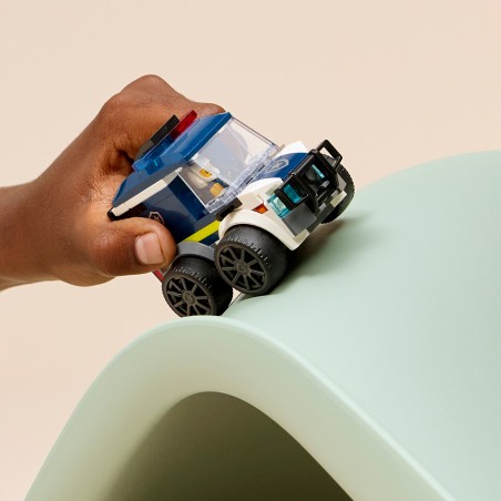 ¡Desata trepidantes aventuras policiales con el minikit de construcción LEGO® City Vehículos: Furgoneta de Policía! Esta compacta furgoneta de policía de juguete construible con modernas llantas, neumáticos de goma de perfil bajo, parachoques de empuje, barrotes de prisión y luces de emergencia de juguete ofrece a tu joven constructor una divertida forma de explorar el mundo de LEGO City. El set incluye también una minifigura de un agente de policía LEGO City Vehículos que cabe perfectamente en la cabina. Contiene 71 piezas.