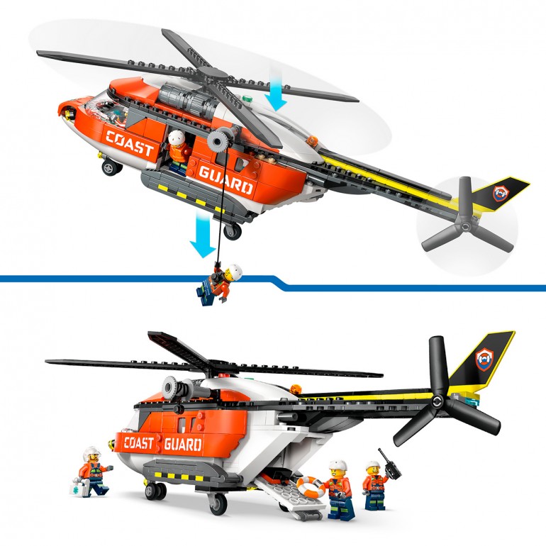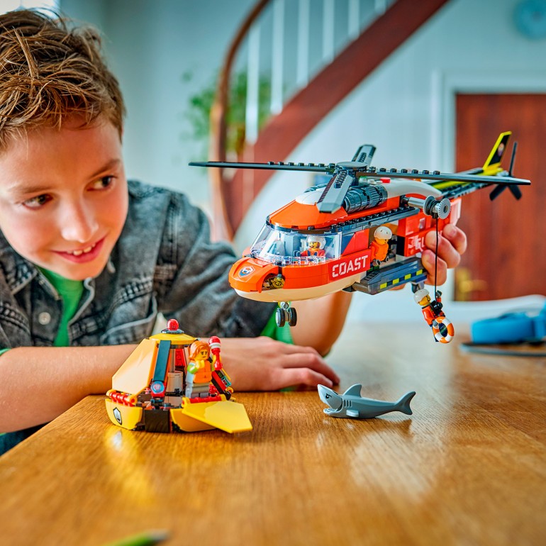 El set de construcción LEGO City Helicóptero de Guardacostas viene repleto de funciones realistas para entusiastas del juego simbólico y los vehículos de emergencia de juguete. El impresionante modelo de helicóptero rojo tiene rotores giratorios, puertas laterales correderas y rampa trasera desplegable, así como numerosos detalles en la cabina y el fuselaje. Los niños pueden bajar a un miembro de la tripulación con el cabrestante del helicóptero, y el set incluye, además, una cápsula de rescate que se abre para acceder a su interior. Con el piloto, el civil, los 2 guardacostas y el tiburón, ¡les esperan horas de juego imaginativo! Contiene 551 piezas.