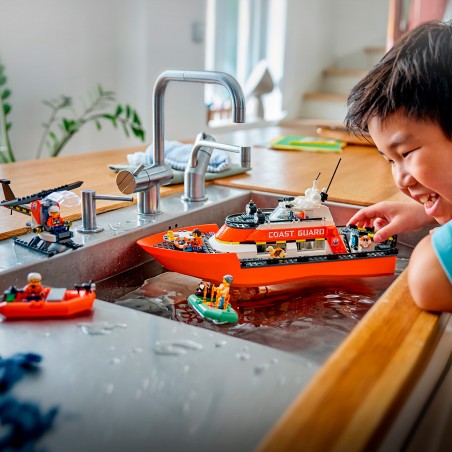 Los peques podrán embarcarse en aventuras oceánicas con el juguete LEGO City Barco y Helicóptero de Rescate de Guardacostas. Este detallado barco flotante con cubiertas desmontables permite acceder fácilmente al puente de mando, los camarotes y la cocina para jugar. Los niños pueden lanzar una lancha de rescate desde la rampa o despegar a bordo del helicóptero que espera en la plataforma de aterrizaje del barco. El set incluye también una segunda lancha, llamas LEGO,5 minifiguras y una figura de un perro. Las 3 embarcaciones flotan en el agua. Contiene 742 piezas.