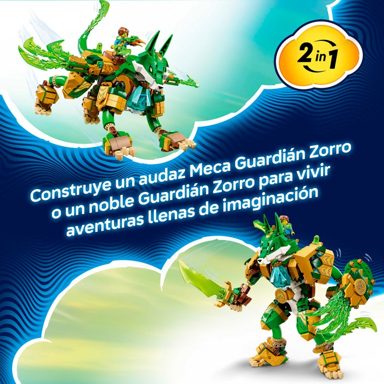 Desata la imaginación de tu peque con el set LEGO DREAMZzz Meca Guardián Zorro, un meca de juguete de fantasía que ofrece 2 opciones de construcción. Los jóvenes soñadores se lo pasarán genial construyendo un zorro como un poderoso Meca Guerrero Zorro, erguido sobre 2 patas y armado con espada y escudo, o como un majestuoso Guardián Zorro de 4 patas provisto de alas. Las minifiguras de Mateo, Izzie y el Emperador Pesadilla inspirarán imaginativas historias, y cada una cuenta con una espada personalizada en un color a juego con su personaje. Además, los niños se divertirán descubriendo 2 figuras de Grimspawns, una figura de Z-Blob y un huevo de diamante del que nace una Criatura del Tesoro verde. El set contiene 883 piezas.