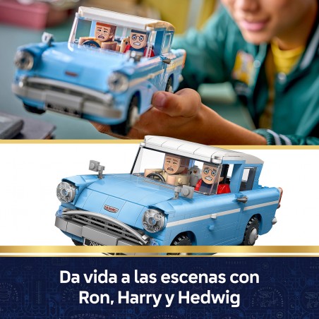 Pon la magia del Ford Anglia Volador Encantado de los Weasley en las manos de tu joven mago, bruja o Muggle con este set de construcción del famoso coche para exponer y jugar. Coloca las figuras para construir de Ron Weasley y Harry Potter en el coche, así como a Hedwig, la mascota de Harry, y da vida a las escenas de Harry Potter y la cámara secreta. Activa funciones mágicas tanto para abrir el maletero y las puertas como para hacer que el equipaje de nuestros héroes salga volando del maletero, igual que en la película. El set contiene 868 piezas.