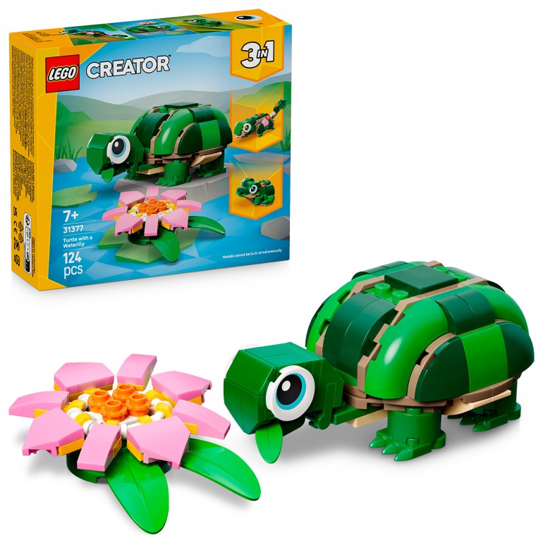 El set de construcción LEGO Creator 3 en 1 Tortuga con Flor de Nenúfar les permite interpretar creativas historias con animales. Este simpático juguete ofrece 3 opciones de construcción diferentes con los mismos ladrillos. Los peques pueden construir una tortuga de juguete con cabeza y boca articuladas, así como la preciosa flor de nenúfar rosa que la acompaña, y luego convertirla en un camaleón de juguete con cabeza y cola articuladas o en una rana de juguete con boca móvil. El set contiene 124 piezas.