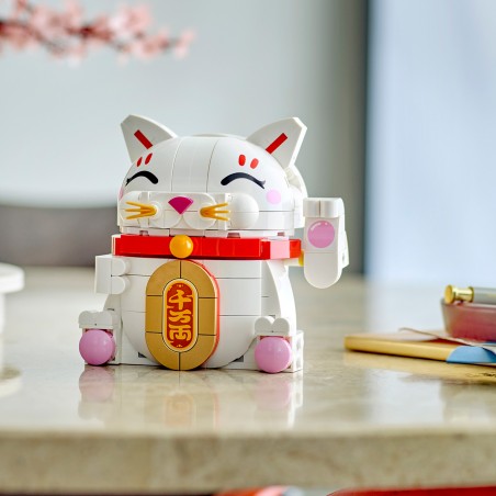 El set de construcción LEGO® Gato de la Buena Suerte, además de destacar como figura ornamental, ¡también podría traer suerte a quien lo posea! Este modelo de un gato que invita a entrar es un divertido regalo para niños y niñas o para cualquier persona que celebre la Fiesta de la Primavera. Construye los detalles y agrega los ojos sonrientes del felino, sus bigotes, sus mejillas sonrosadas, las almohadillas de las patas y la cola. Después, elige si quieres decorar el panel de la barriguita con el adorno en forma de moneda de oro o con el deseo escrito de buena fortuna. La pata se balancea para reproducir el movimiento de invitación a entrar de las figuritas de gatos de la suerte tradicionales.