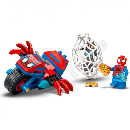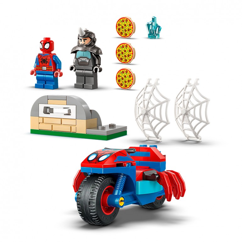 Este set de construcción, que incluye una moto con forma de araña y minifiguras de Spideyy Rino, es perfecto para ayudar a los más jóvenes a desarrollar su creatividad. Los niños colaboran con Spidey para recuperar una joya azul robada, esquivar las pizzas voladoras disparadas por Rino con su cañón-horno de pizza y capturar al villano en una telaraña gigante conectable a la moto. Contiene 61 piezas.
