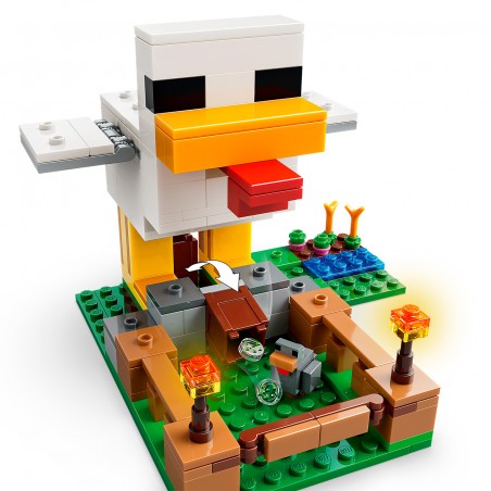Este set de construcción desafía a los jugadores a cuidar de una gallina fría y una gallina bebé con una minifigura del Fan del Pollo mientras se enfrentan a un zorro (a quien le gusta comer gallina fría) y un zombi bebé (a quien le gusta hacer de jinete a lomos de las gallinas). El gallinero de juguete tiene forma de gallina con alas móviles y un corral delante con una puerta que se abre. La gallina gigante pone huevos y también vierte semillas por la boca en un contenedor que se inclina cuando las gallinas necesitan comida. Incluye divertidos accesorios: antorchas, heno, un ahumador, 2 huevos, 2 montones de semillas, un muslo de pollo, una pluma y un hacha. El set contiene 233 piezas.