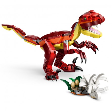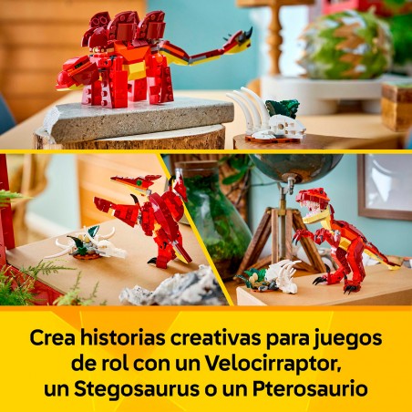Este divertido y detallado dinosaurio de juguete ofrece 3 opciones de construcción con los mismos ladrillos. Los peques pueden construir un Velocirraptor (con mandíbula, cabeza, brazos, patas y cola articulados) y luego convertirlo en un Stegosaurus (con cuello, cabeza y patas móviles) o en un Pterosaurio (con alas, cabeza y pies articulados). Cada modelo incluye un cráneo y una caja torácica, huevos y una planta. Al acabar de jugar, se puede exponer en la habitación como objeto decorativo. El set contiene 283 piezas.