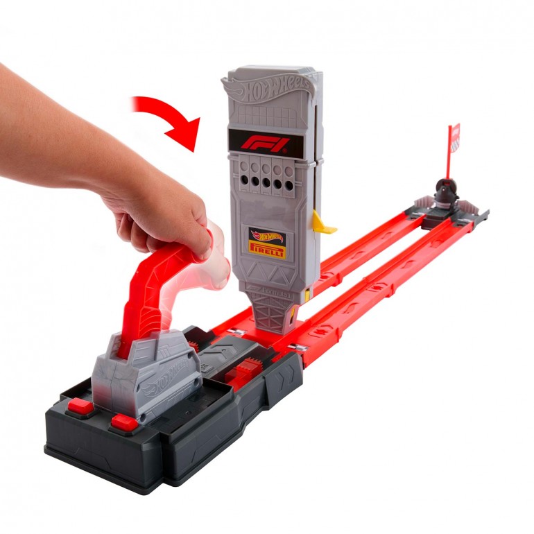 Ponte en el lugar de los pilotos de carreras de F1 reales con el conjunto de pista Línea de salida de Fórmula 1 de Hot Wheels Racing. Incluye 2coches metálicos de Fórmula 1 de Hot Wheels a escala 1:64 para que puedas echar carreras cara a cara de forma inmediata. Coloca dos coches en los lanzadores, sube la palanca de la torre de salida y céntrate en la cuenta atrás. A continuación, pulsa los botones para empezar a correr. La bandera a cuadros que está al final de la pista declarará al ganador.