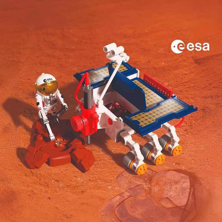 Desarrollado en colaboración con la Agencia Espacial Europea (ESA), PLAYMOBIL lleva la fascinación de la exploración espacial directamente al cuarto de los niños. ¡Con el Mars Rover comenzarás tu propia misión en Marte! Equipado con perforadora, cámaras y sensores de alta tecnología, este astromóvil busca rastros de vida a gran profundidad bajo la superficie. Sus paneles solares desplegados proporcionan la energía necesaria para los aparatos científicos: las cámaras panorámicas y de visión cercana ayudan a seleccionar lugares prometedores, mientras que el radar y el espectrómetro examinan el suelo. Las muestras se analizan con instrumentos especiales.